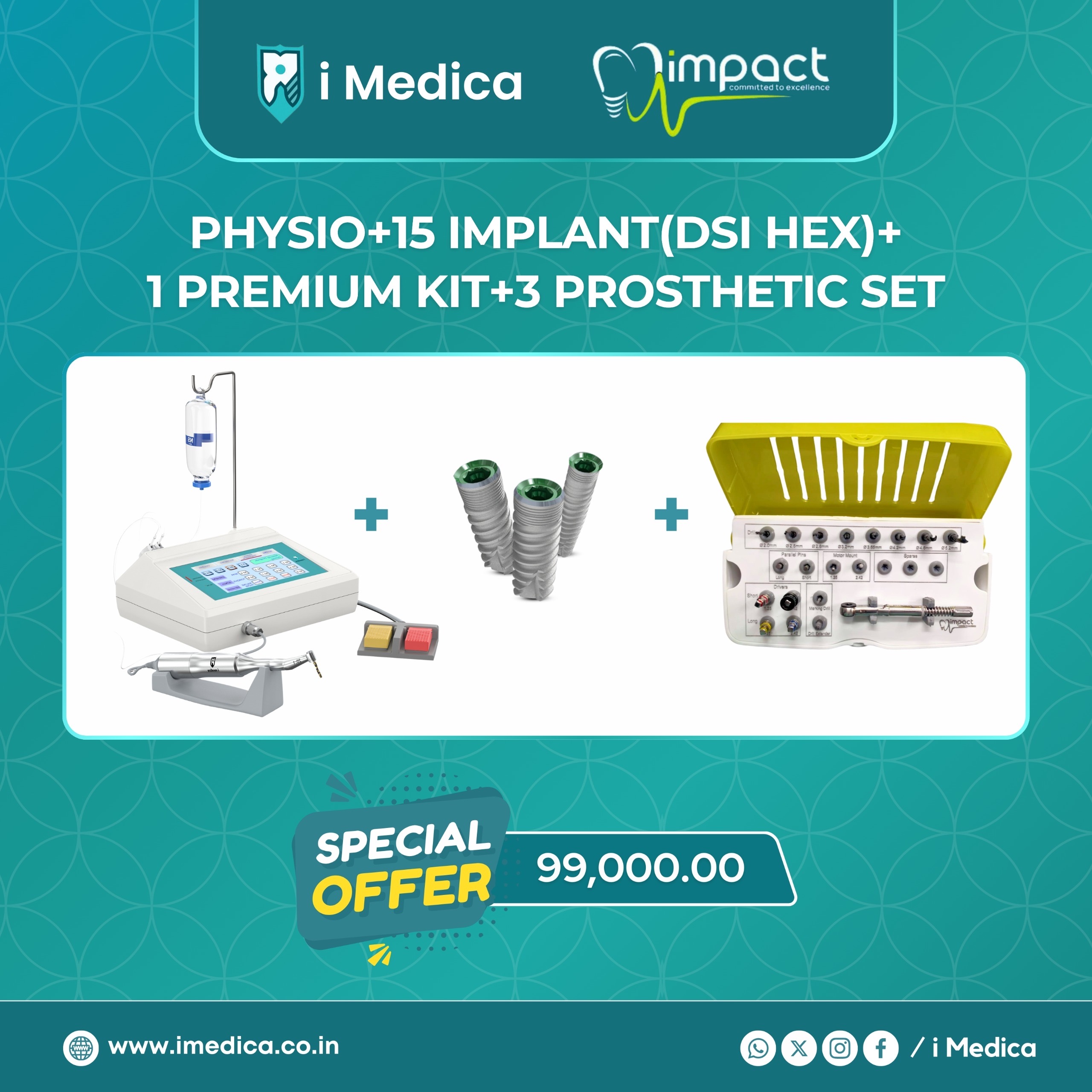 Buy 15 Impact DSI HEX implant + 1 Premium surgical kit + 3 Prosthetic set + 1 i-Medica’s implant motor only in
